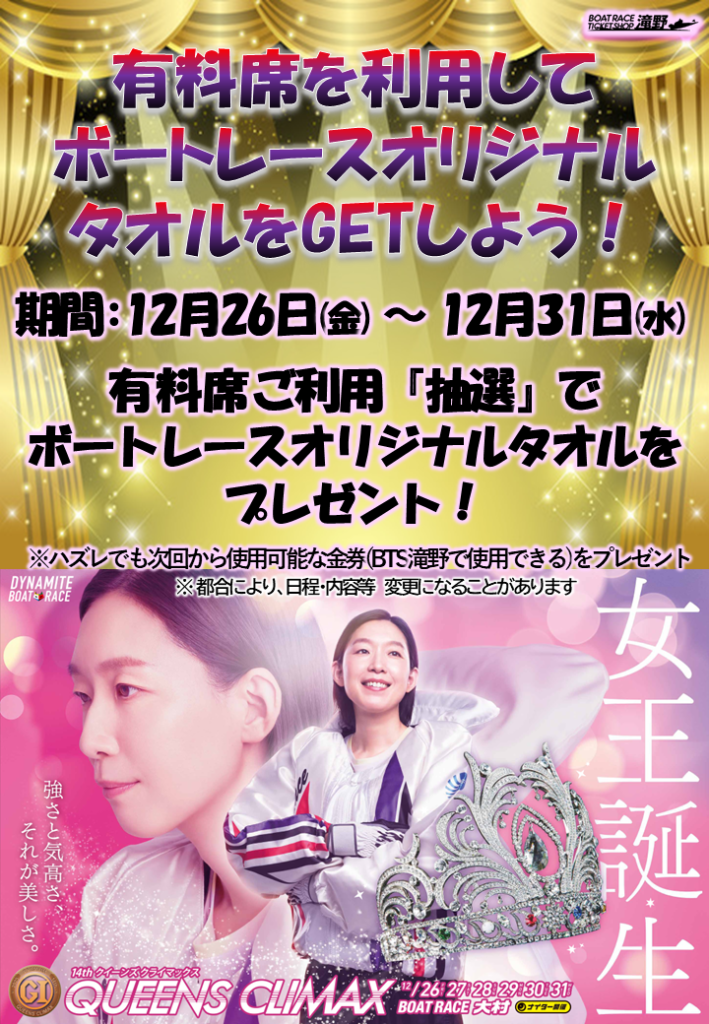 | 12月26日~有料席ボートレースオリジナルタオルプレゼント(抽選) | ||